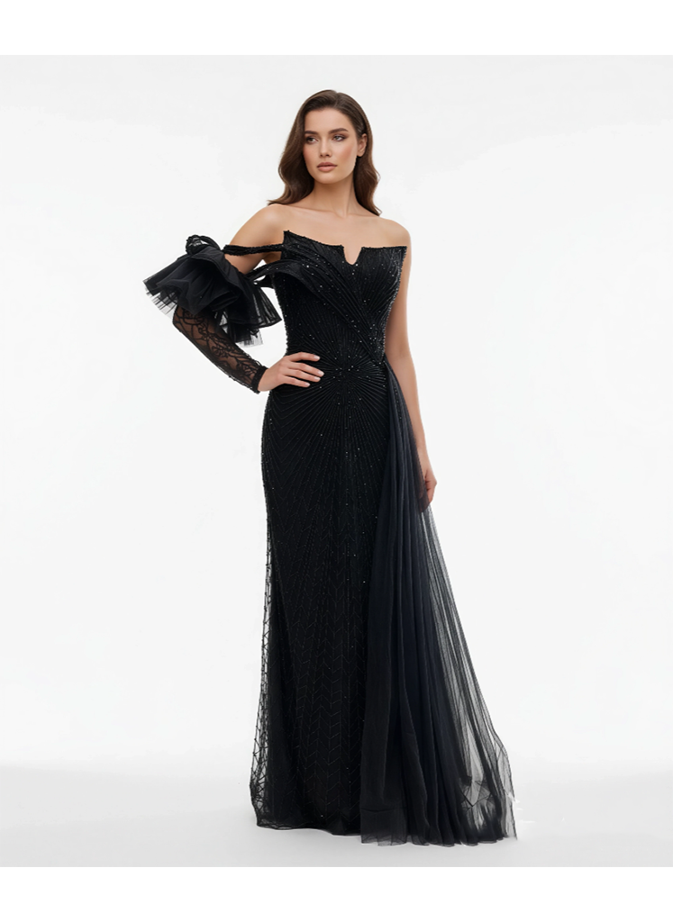 Crafted from high-quality stretch fabric, it ensures both structure and comfort — perfect for weddings, galas, and special celebrations. The sleek side slit and flowing train add a touch of drama and sophistication to every step.