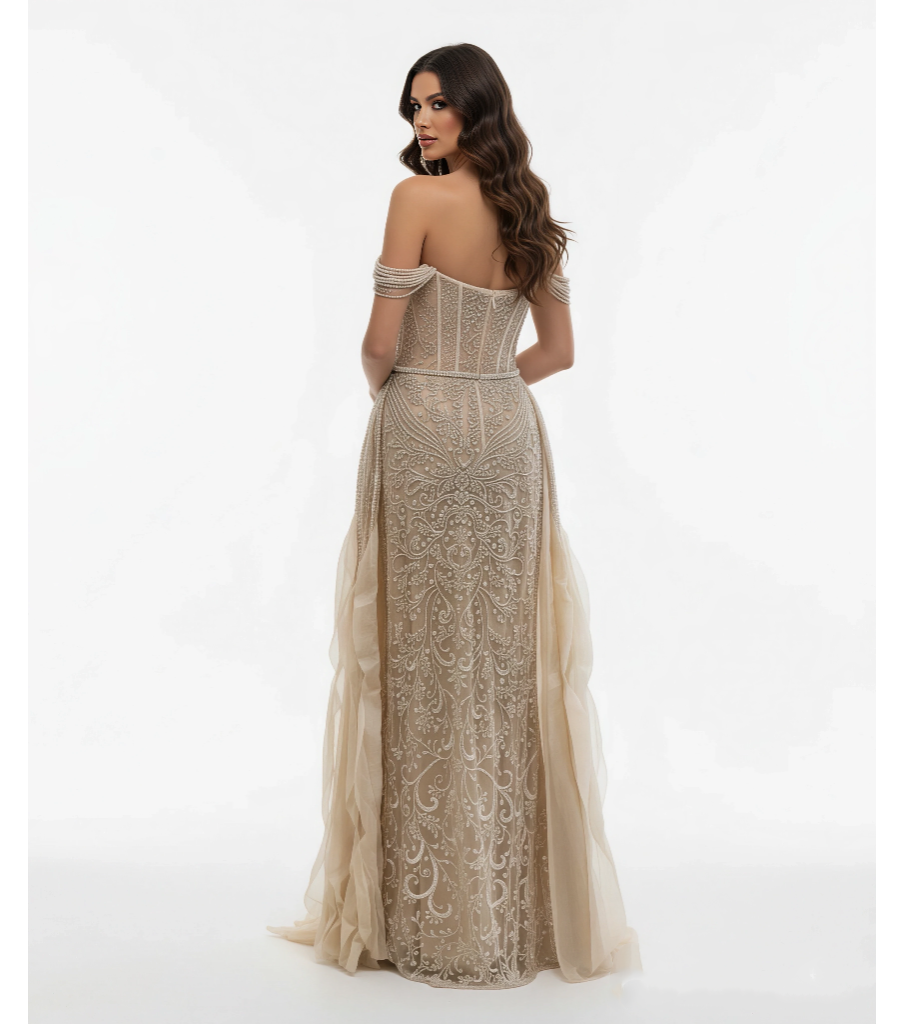 Make an unforgettable impression in this exquisite off-shoulder bodycon gown, designed to beautifully shape your silhouette and highlight your natural grace. Featuring delicate 3D floral appliqués on the sleeves and a pleated sweetheart neckline, this masterpiece blends romance, elegance, and modern luxury.